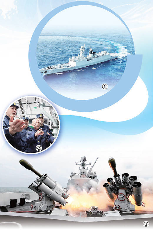图①:舟师红河舰进行舰艇灵活转向。 李政操摄 图②:一等元勋王木昌(右二)参不雅红河舰。 刘 嘉摄 图③:舟师红河舰进行实射火箭深弹西宾。 李 眺摄